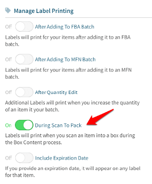 Additionally, you can further optimize your workflow by enabling the “During Scan to Pack” option within your Print Settings. With this setting enabled, your FNSKU labels will automatically print as you scan items, eliminating the need for manual printing and minimizing interruptions during the packing process