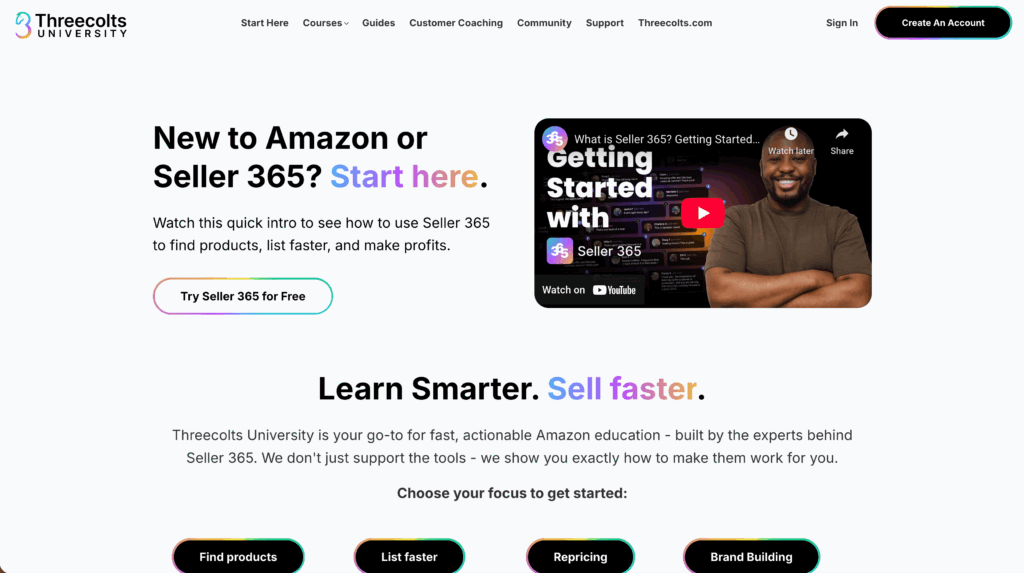 Before investing thousands in premium courses, consider starting with comprehensive free resources. Threecolts University offers extensive Amazon selling education at no cost, built by ecommerce veterans and the experts behind Seller 365.