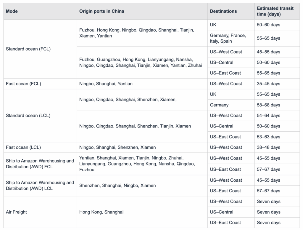 Amazon Global Logistics (AGL) is Amazon’s integrated freight service that ships your FBA inventory from China and Vietnam directly to fulfillment centers across multiple countries. The service covers ocean freight (both full containers and shared space) plus air freight for faster delivery.