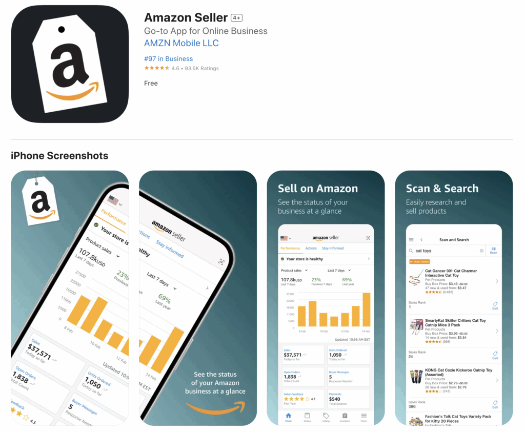 The app shines for quick tasks like barcode scanning to research products, switching between different marketplace accounts, and getting customizable notifications for important updates. It even includes a Product Photo Studio for taking professional-looking listing photos right from your phone. Eight main functions cover everything from monitoring sales performance to running advertising campaigns on the go.