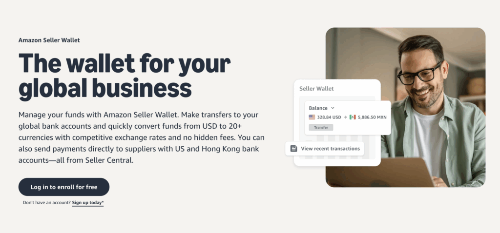 Seller Wallet manages your Amazon sales proceeds globally with competitive exchange rates and no hidden markups. You can convert currencies on demand into over 20 different options, with transfers typically available the next business day.