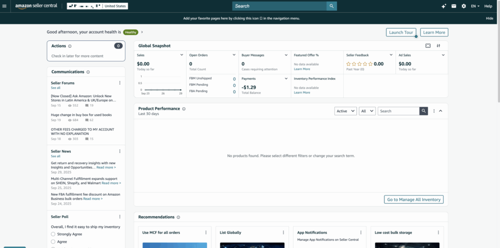 Amazon Seller Central serves as your command center for everything Amazon-related. You’ll manage products, track orders, handle pricing, oversee fulfillment, monitor payments, and check your performance metrics all from this central dashboard.