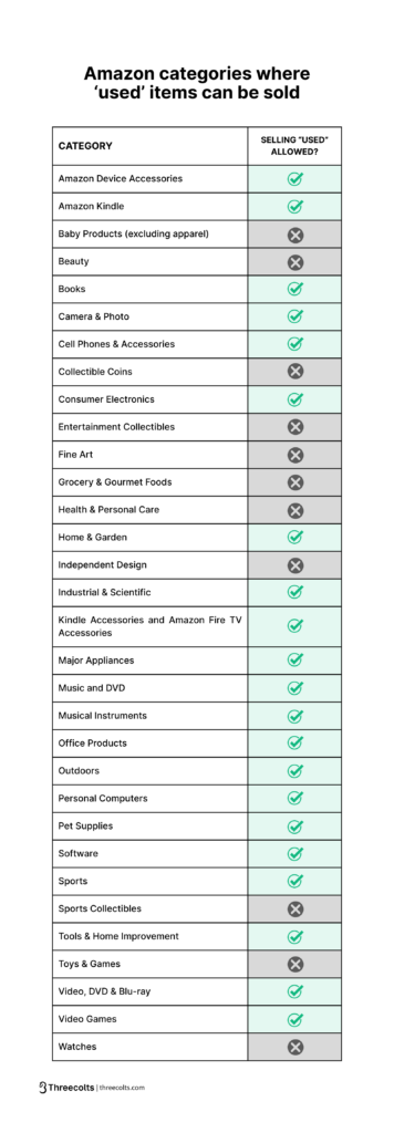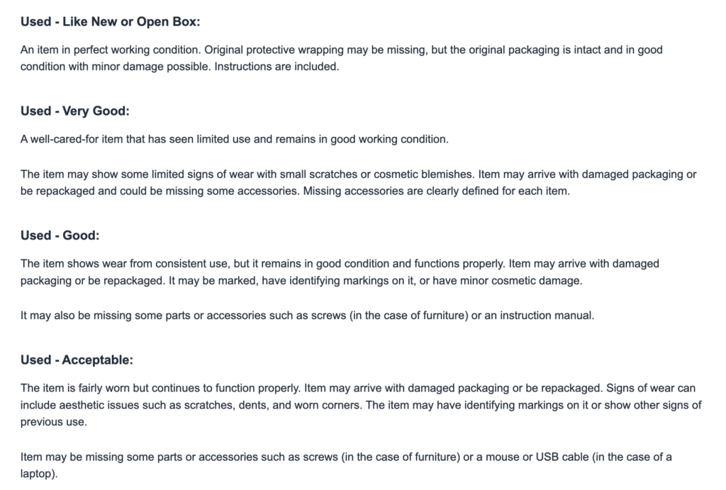 In broad terms, Amazon offers an array of categories for sellers to post their used items. Amazon sellers are required to accurately categorize their used goods for sale on the platform based on their condition.