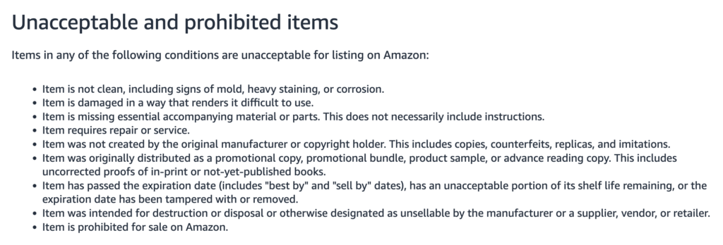 Amazon’s list of unacceptable and prohibited items is what separates it from other marketplaces like eBay. Amazon maintains a strict policy on the types of used items that can be listed for sale as part of its commitment to upholding its reputation.